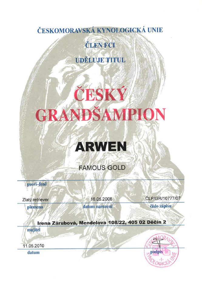 Arwínka byla naší první fenkou zlatého retrívra s průkazem původu. Byla to nádherná „elfka“ s krásnou hlavou a milým výrazem, jak se často opakuje v jejich posudcích z výstav. Měla neskutečný „show“ temperament, úžasný pohyb. Výstavní kruhy si opravdu užívala. Dosáhla mnoha úspěchů na poli výstavním (první fena GR v ČR, která získala titul Klubový šampion KCHLS) i pracovním. Spolu jsme začaly vnikat do tajů myslivecké kynologie, honů atd. Byla velmi aktivní i v canisterapii, kde pracovala až do svého veteránského věku pod „žlutou značkou“ společnosti HELPPES. Dala nám náš první a jedinečný vrh A PURE SOUL, kdy se narodilo 9 krásných štěňátek. Byl to náš Arwíšek – Červíček, Bělužníček, děti jí při canisterapii říkaly Sněhurka. Ve svých čerstvě osmi letech onemocněla autoimunitní hemolytickou anémií (AIHA), kterou zdárně překonala, snad jako jediný pes, o kterém jsem kdy slyšela. Byl to nejhodnější a nejstatečnější pes na světě. Zemřela ve věku 13 let, 3 měsíců a 7 dní na následky mozkové mrtvice.